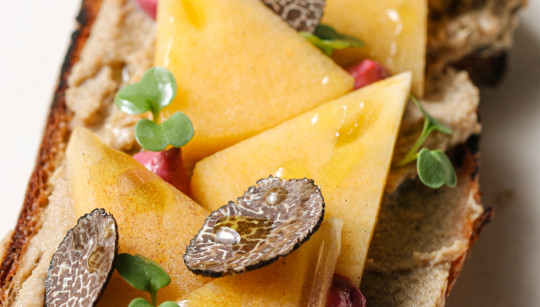 Брускетта с утиным паштетом и хурмой