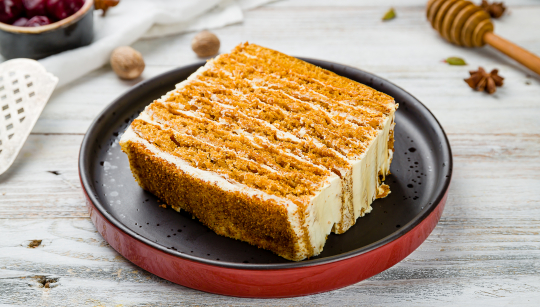 Масло сливочное, яйцо куриное, мед, сода пищевая, мука пшеничная, сахар, сливки 33%, сметана 20%.