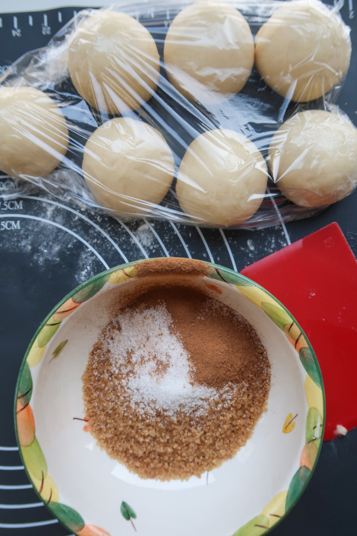 Выложите плюшки на противень, застеленный бумагой для выпечки и накройте кухонным полотенцем (или пищевой пленкой). Уберите в теплое место на 1 час (теплая выключенная духовка, как вариант).
