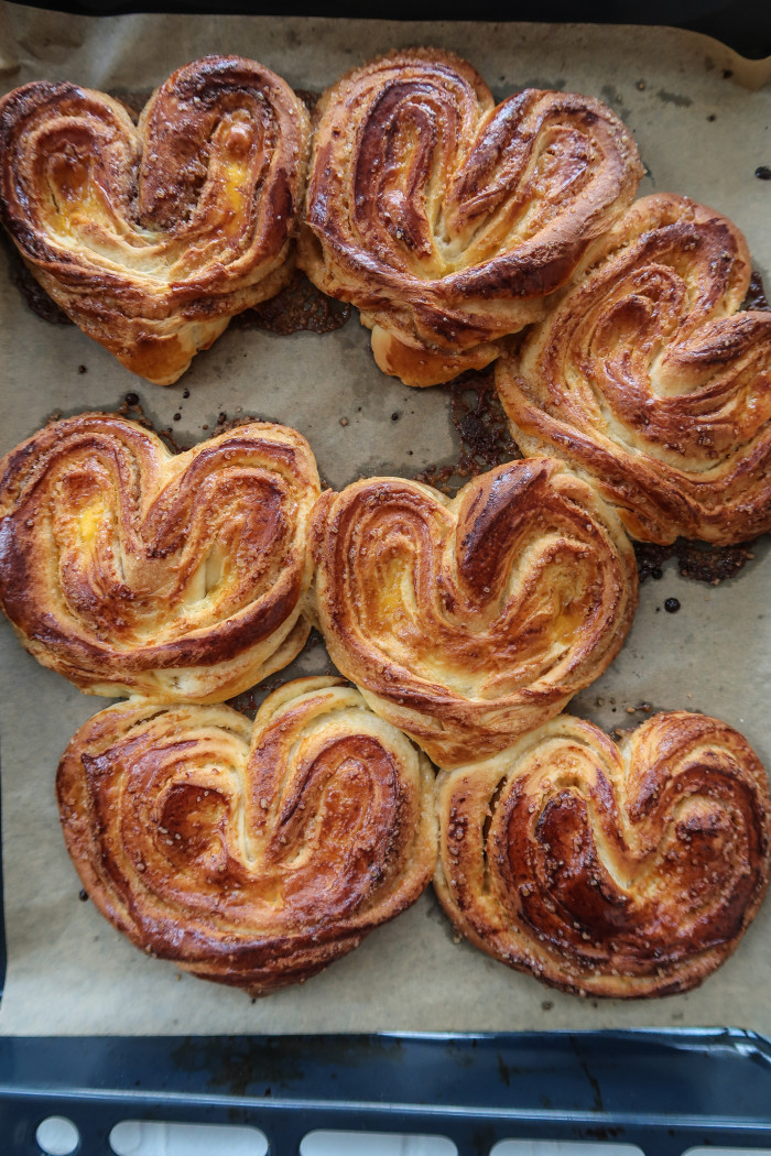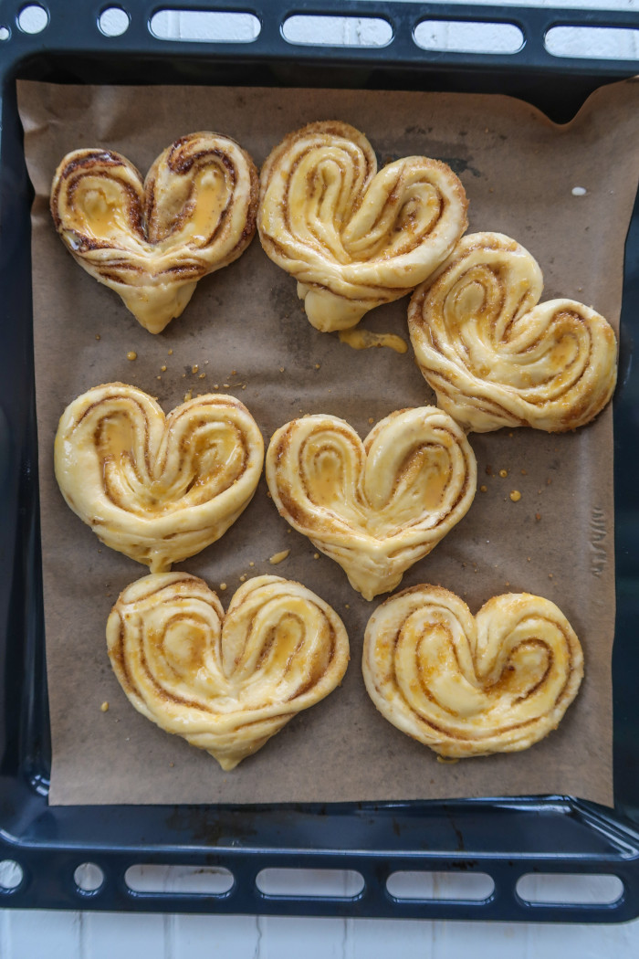 С противоположной стороны, там, где сгиб сделайте с помощью ножа надрез. Разверните «крылья» в форме сердца. Можете еще слегка подрезать надрез кулинарным ножницами (но не увлекайтесь), чтобы плюшка полностью развернулась.