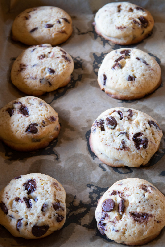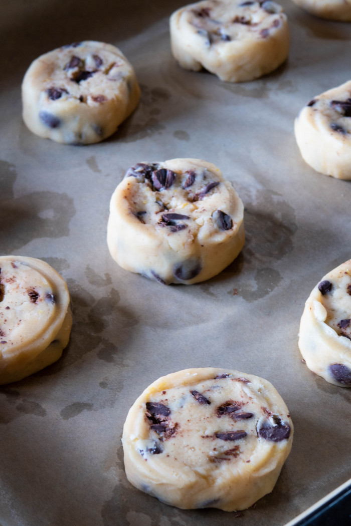 Слепите руками печенья среднего размера и разложите на приличном расстоянии друг от друга. Советую убрать печенья перед выпечкой минут на 30 в морозилку, так они лучше будут держать форму. Печенья можно сложить на доску, присыпанную мукой для выпечки.