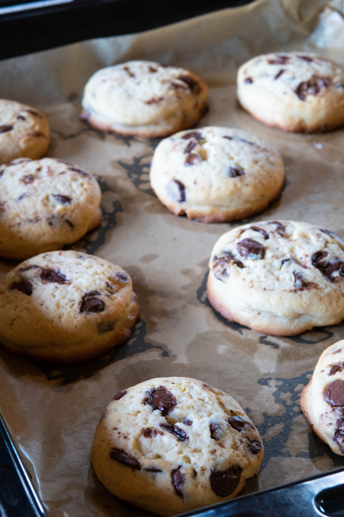 Теперь просейте туда муку, добавьте разрыхлитель и морскую соль. Перемешайте. Добавьте шоколад каплями или порезанный на маленькие кусочки. Натрите цедру лимона и добавьте в тесто. Перемешайте.