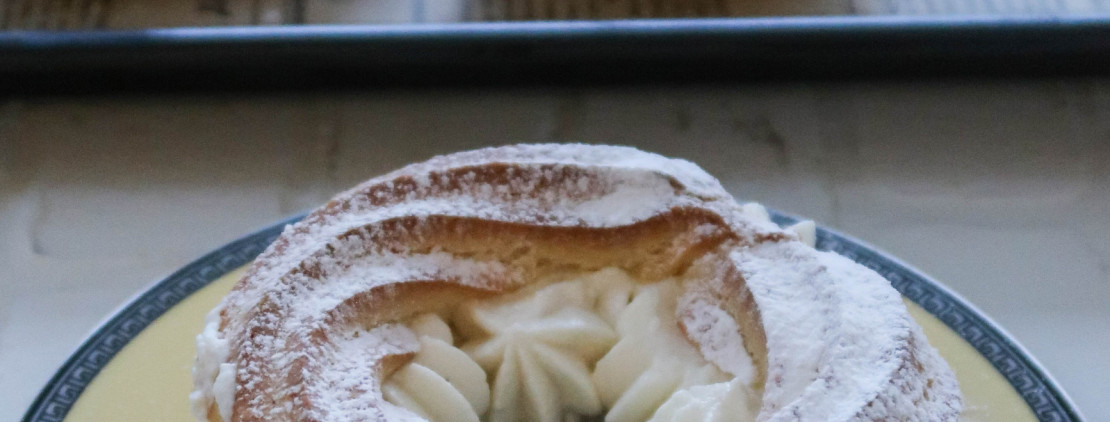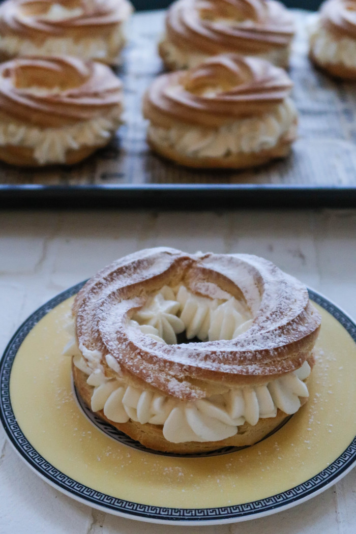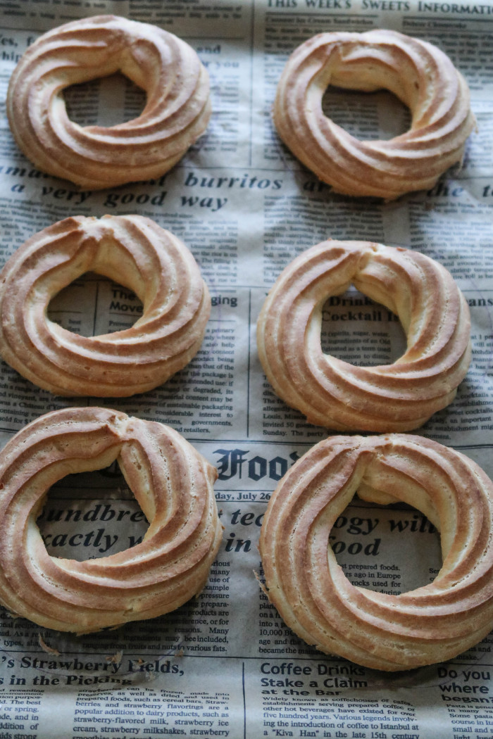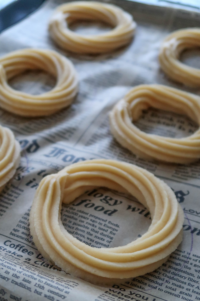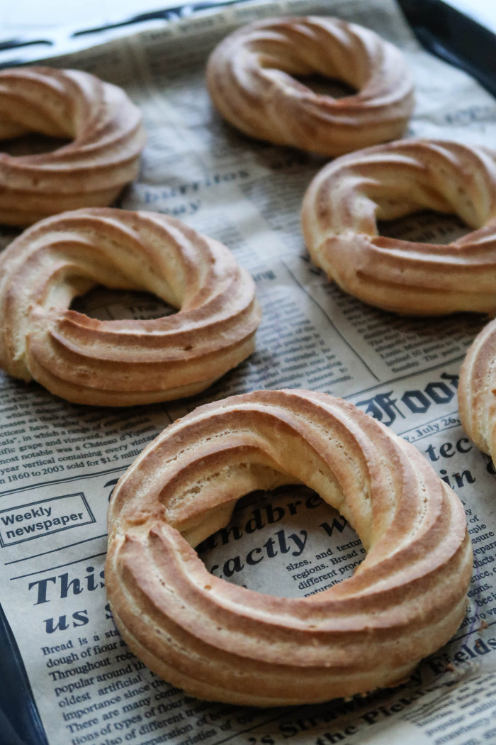 Разогрейте духовку заранее до 230 гр. (за 30 минут) Накройте противень бумагой для выпечки. Если вам удобно, нарисуйте заранее круги (у меня 10 см) и нарисуйте тестом «колечки». Конец заготовки можно аккуратно подправить смоченными водой пальцами.