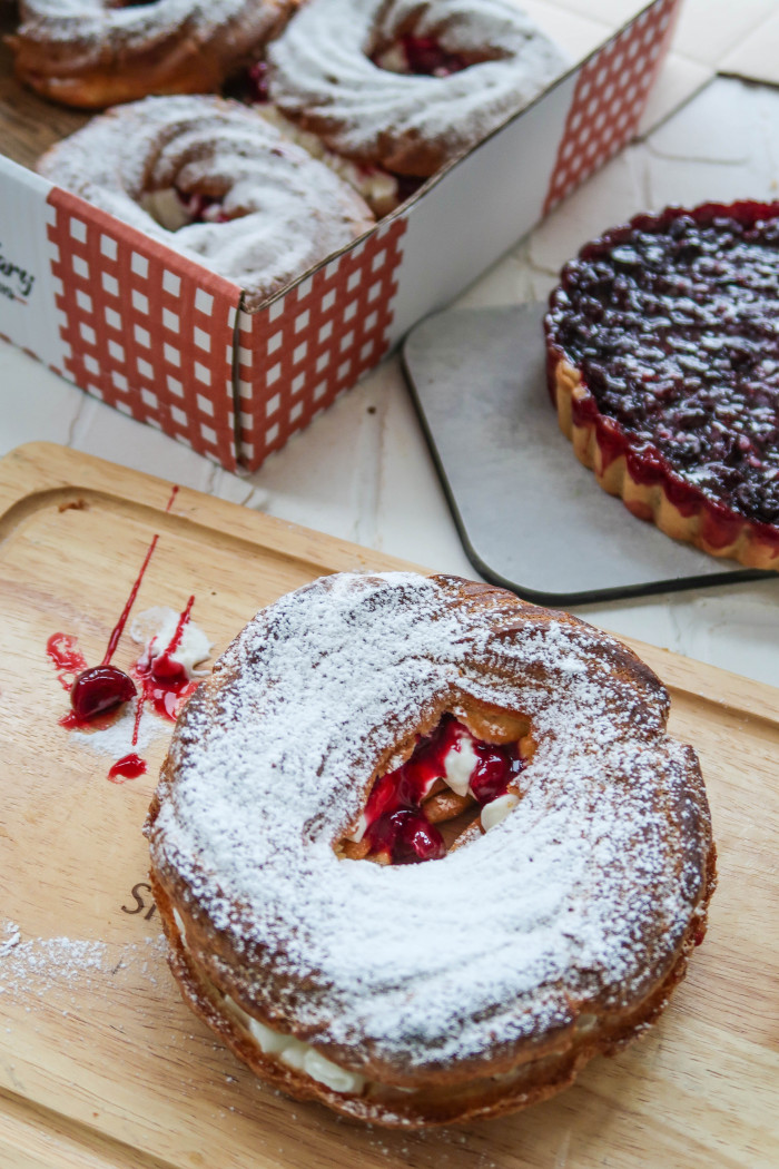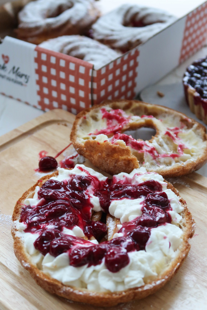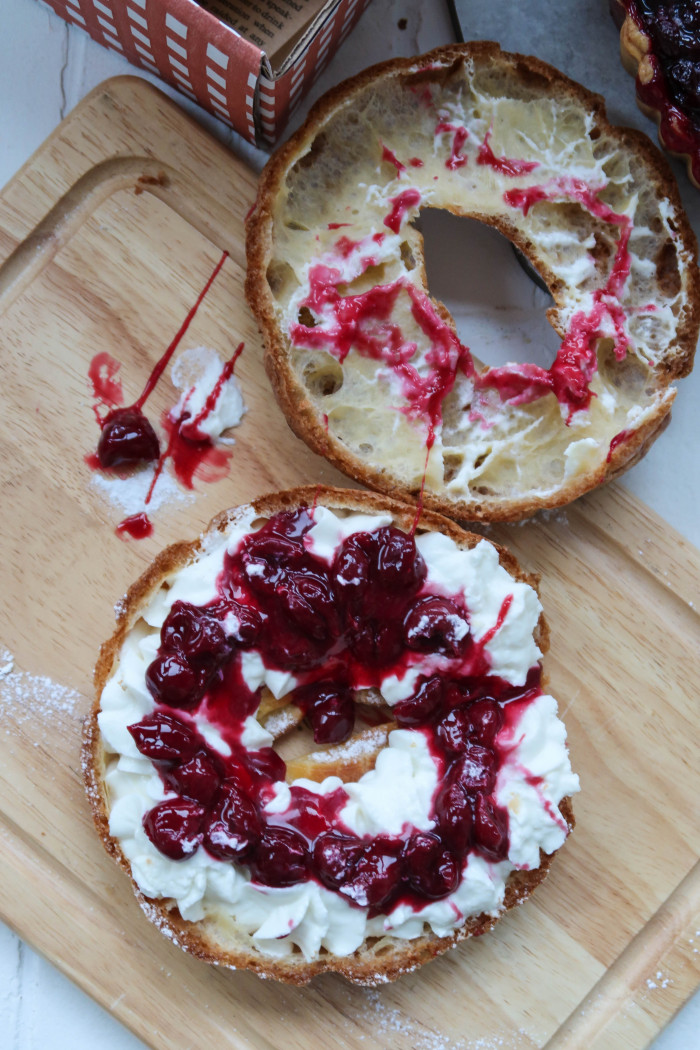 Творожные колечки еще можно приготовить с кремом и вишней. Это просто невероятно вкусное сочетание, начинку можете позаимствовать у пирога с вишней, взяв половину порции. Сначала выложите творожный крем, а затем остывшую вишневую начинку.