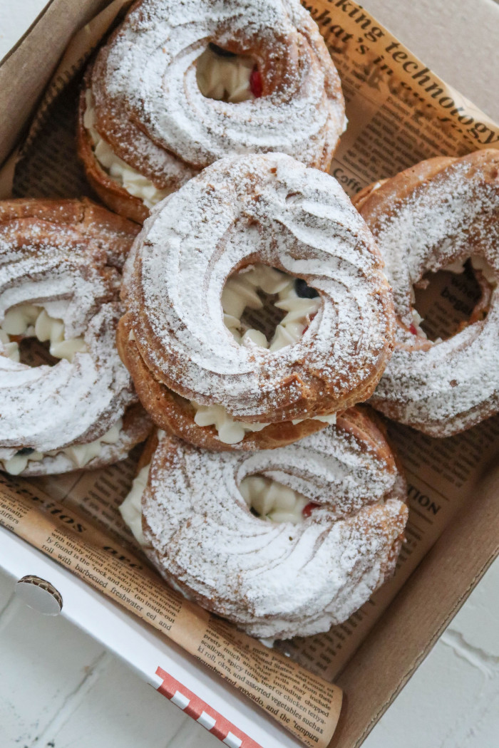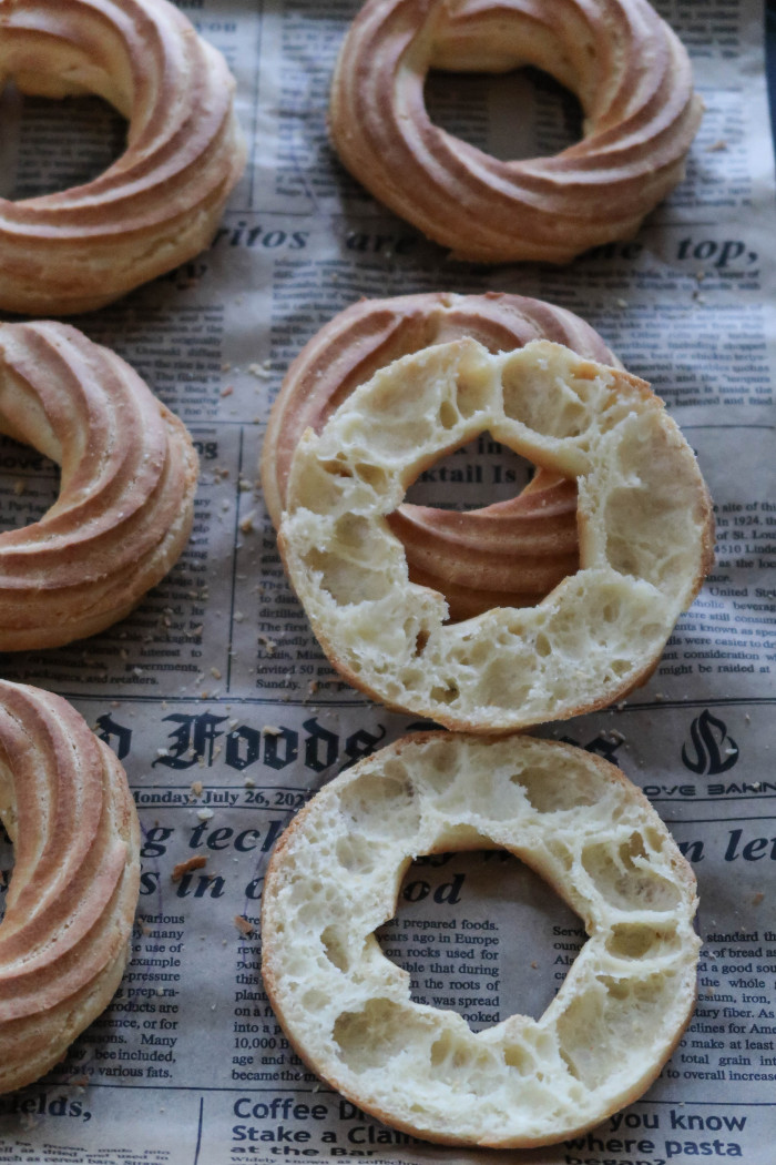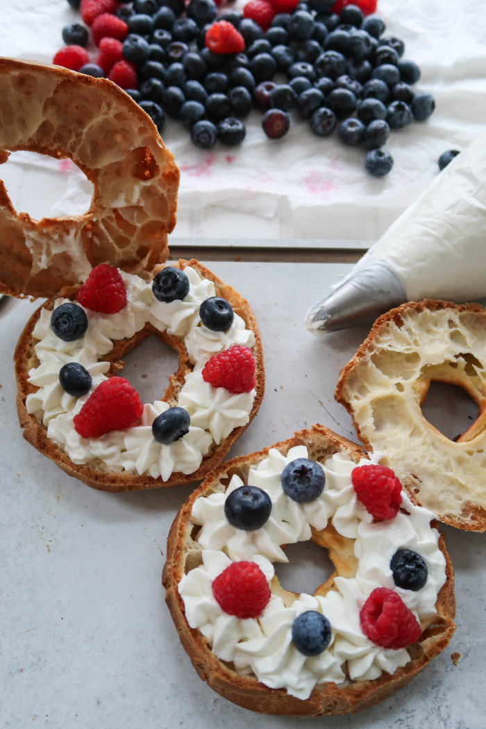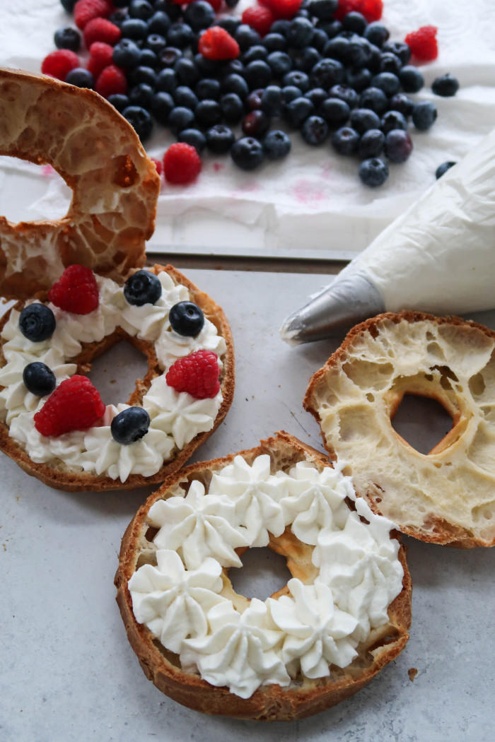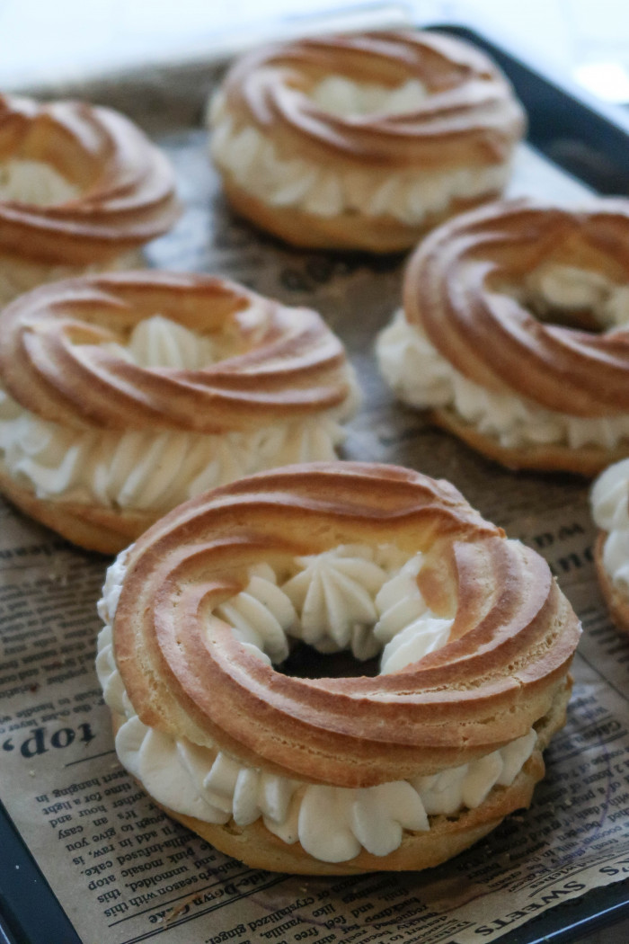 Разрежьте готовые остывшие колечки на две половинки, а далее выложите крем. Если он останется, то можно в два слоя). На творожный крем можно добавить свежие ягоды или вишневую начинку.