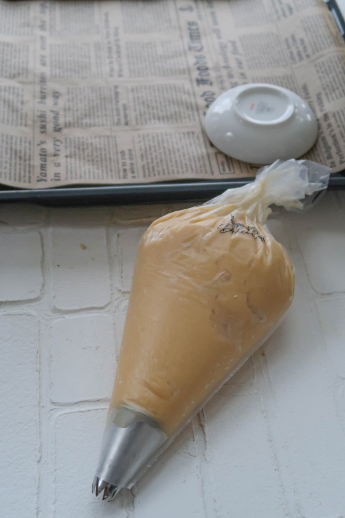 Вводите яйца постепенно (как вариант в три захода) , каждый раз хорошо вымешивая, перед тем как влить новую порцию. Тесто должно быть гладким и однородным, оно может стекать с лопатки широкой лентой. Переложите тесто в кондитерский мешок с насадкой «открытая звезда».