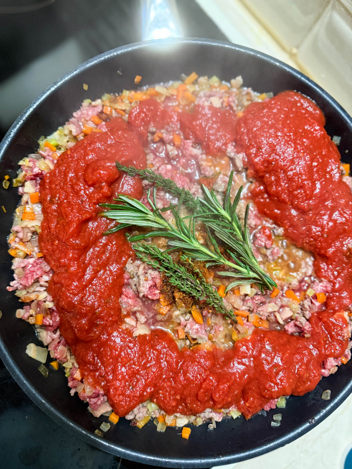 Разогрейте в большой сковороде немного оливкового масла и слегка обжарьте овощи. Добавьте бекон и готовьте вместе до золотистого цвета. Добавьте фарш и обжарьте снова вместе. Влейте томатный соус, добавьте соль, специи и травы. Доведите до кипения, уменьшите огонь, накройте крышкой и тушите в течение примерно 8-10 минут. Влейте немного кипятка, а лучше бульона, если это покажется вам необходимым. Попробуйте на вкус, вытащите травы (если используете) и остудите.
