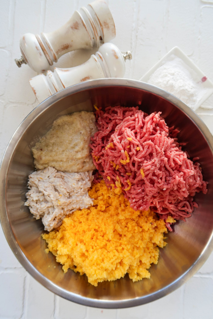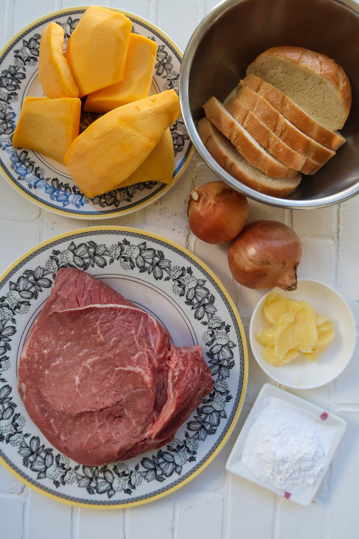 Нарежьте на кусочки мясо и тыкву. Прокрутите с помощью мясорубки. Далее добавьте туда-же обжаренный лук и слегка отжатый хлеб.