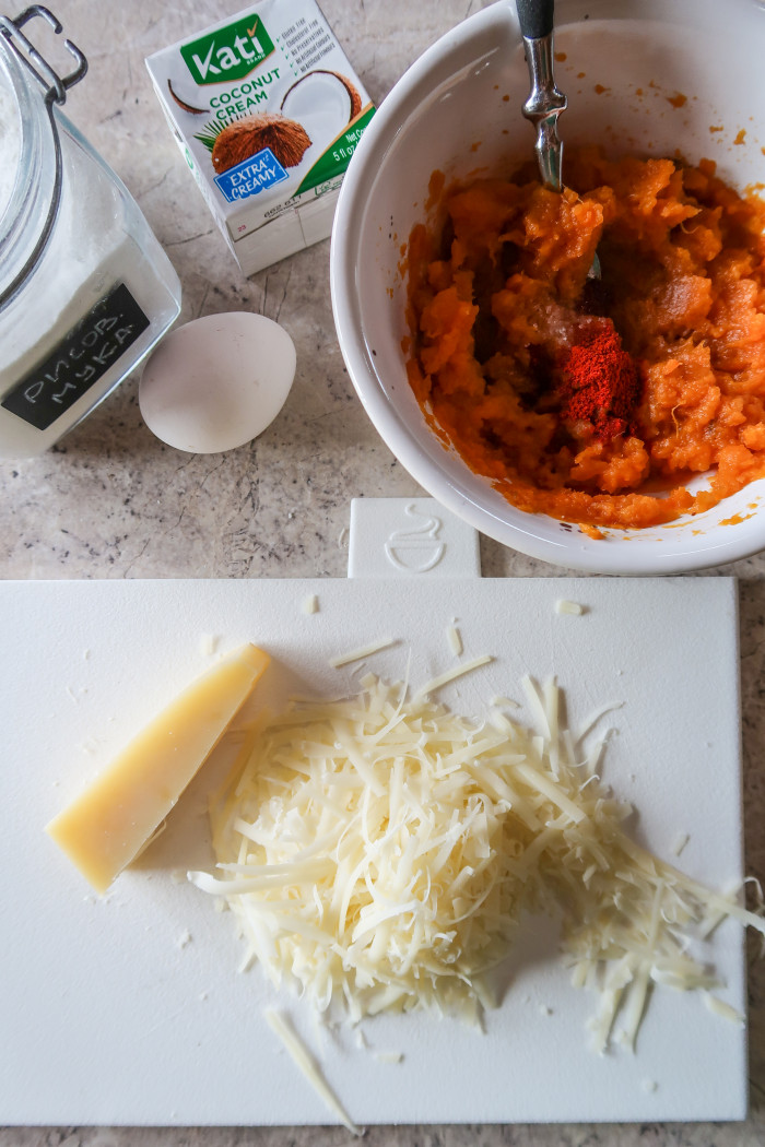 Разомните запеченный батат вилкой и добавьте специи. Добавьте рисовую муку, яйцо, натертый сыр и кокосовое молоко. Перемешайте ложкой. Попробуйте на соль и специи, если необходимо добавьте еще.