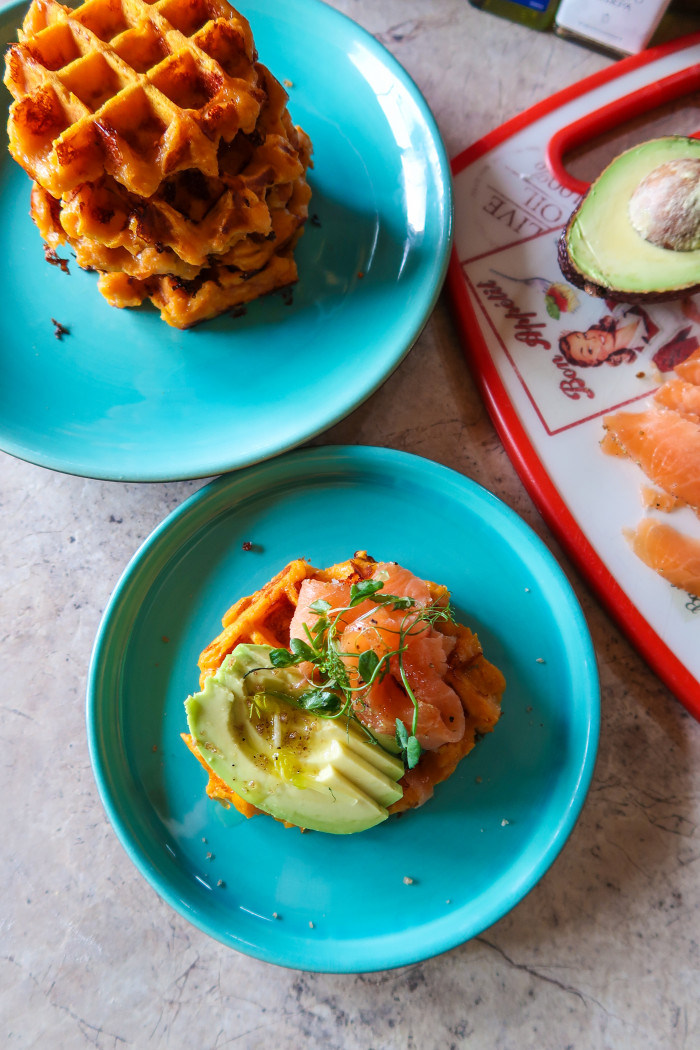 Смажьте вафельницу маслом и приготовьте вафли. Сделайте красивую подачу или поставьте рядом ингредиенты на ваш вкус!