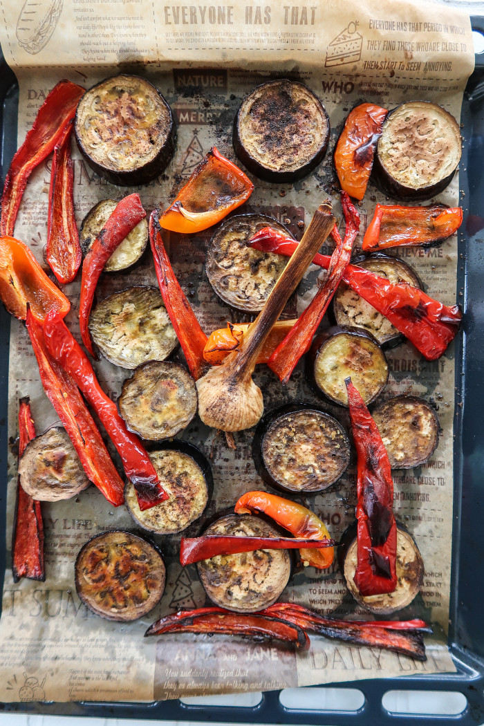 Застелите противень бумагой для выпечки, выложите овощи и добавьте 1\2 головки чеснока. Сбрызните оливковым маслом и посыпьте солью, перцем. Запекайте при температуре 230 гр. в течение 25-30 минут. Высокая температура сохранит форму овощам и придаст красивый цвет. Остудите.