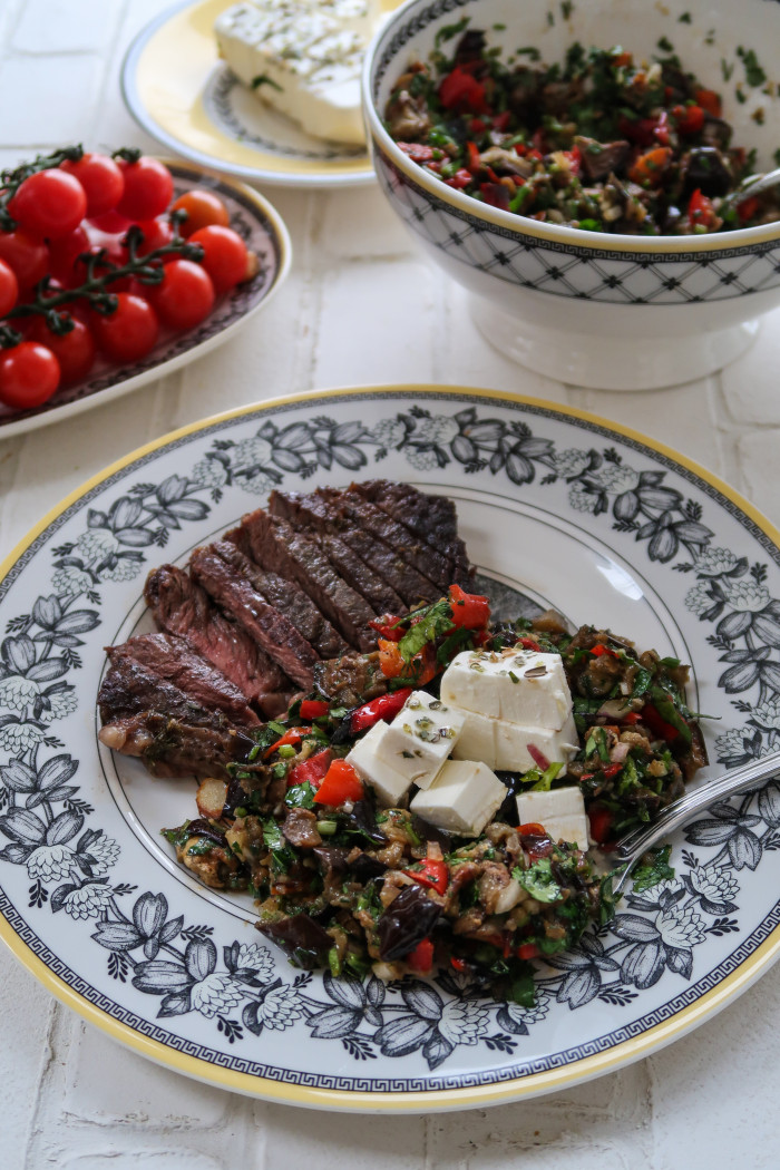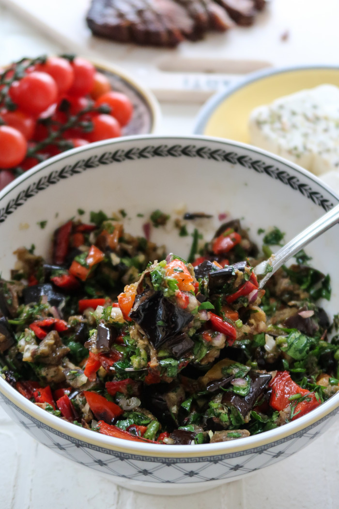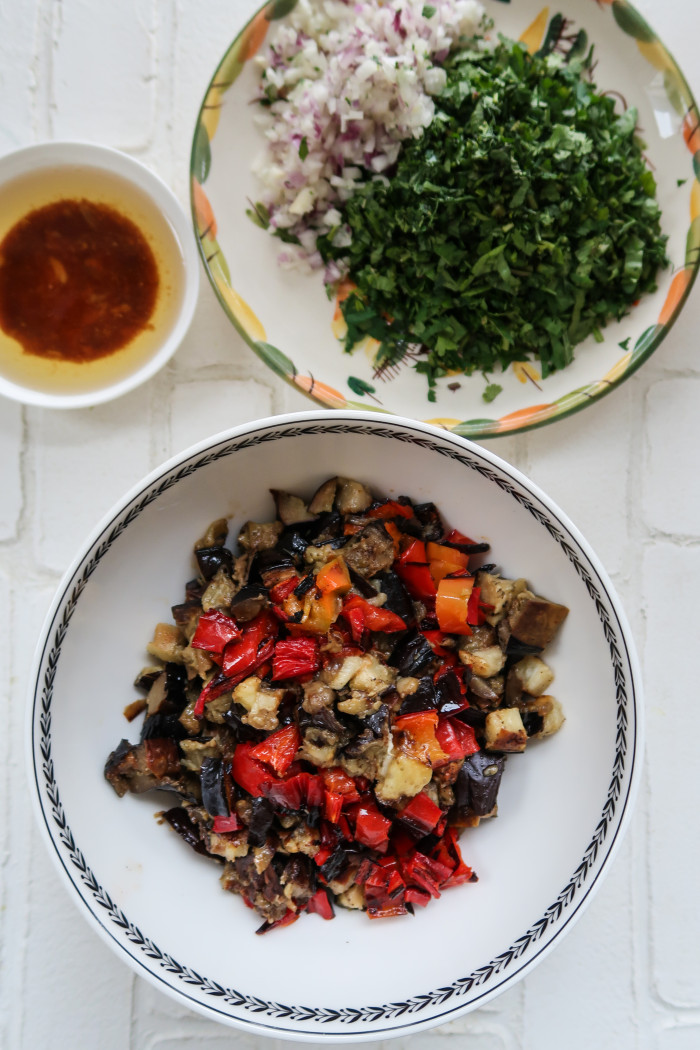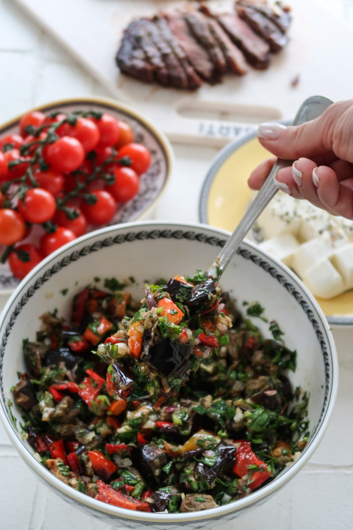 Нарежьте запеченные овощи на кубики. Выложите в салатник. Нарежьте мелко зелень и лук, добавьте к овощам. Заправьте салат и попробуйте на вкус, при необходимости добавьте соль. Идеально добавить к салату немного феты и подавать со стейком. А вообще он сам по себе прекрасен, а на следующий день становится еще вкуснее.