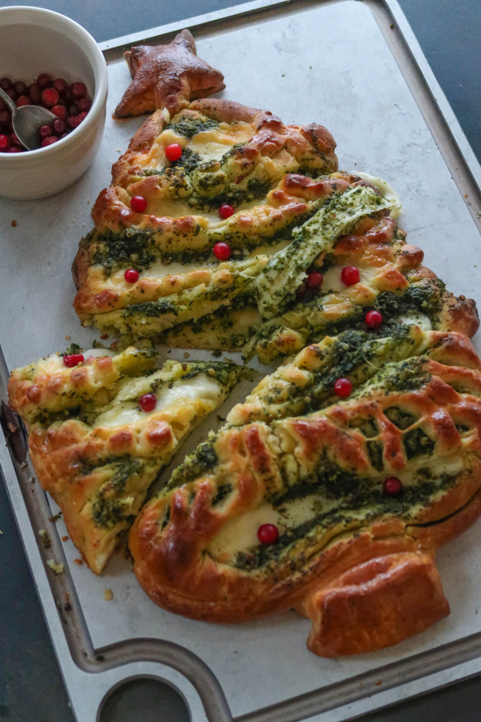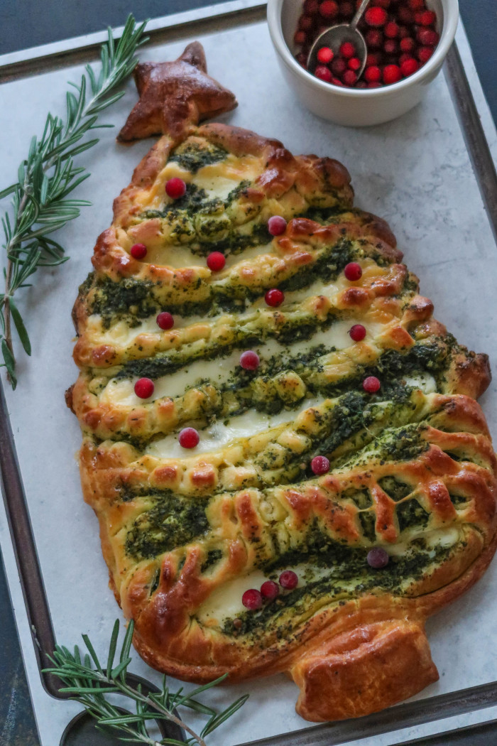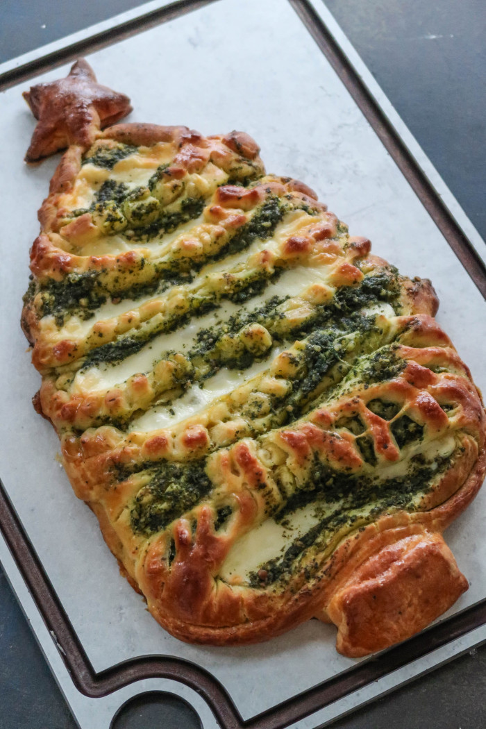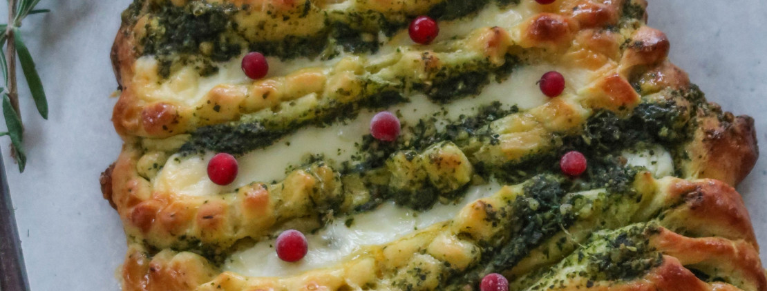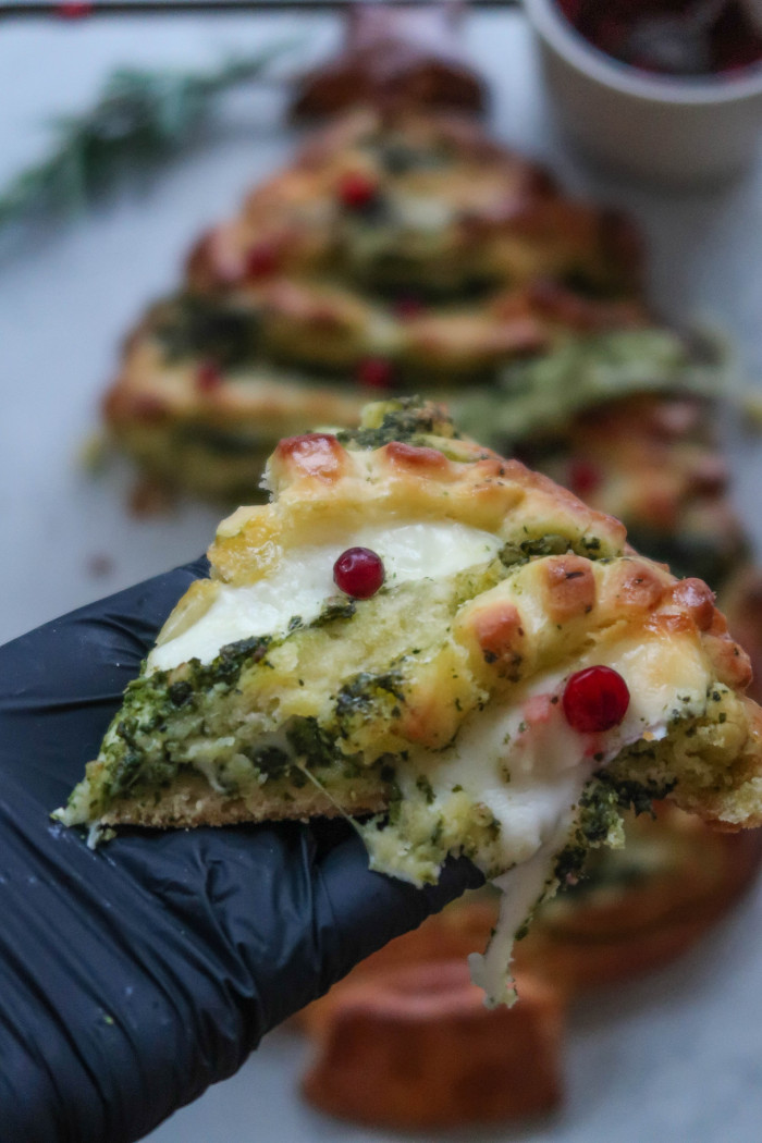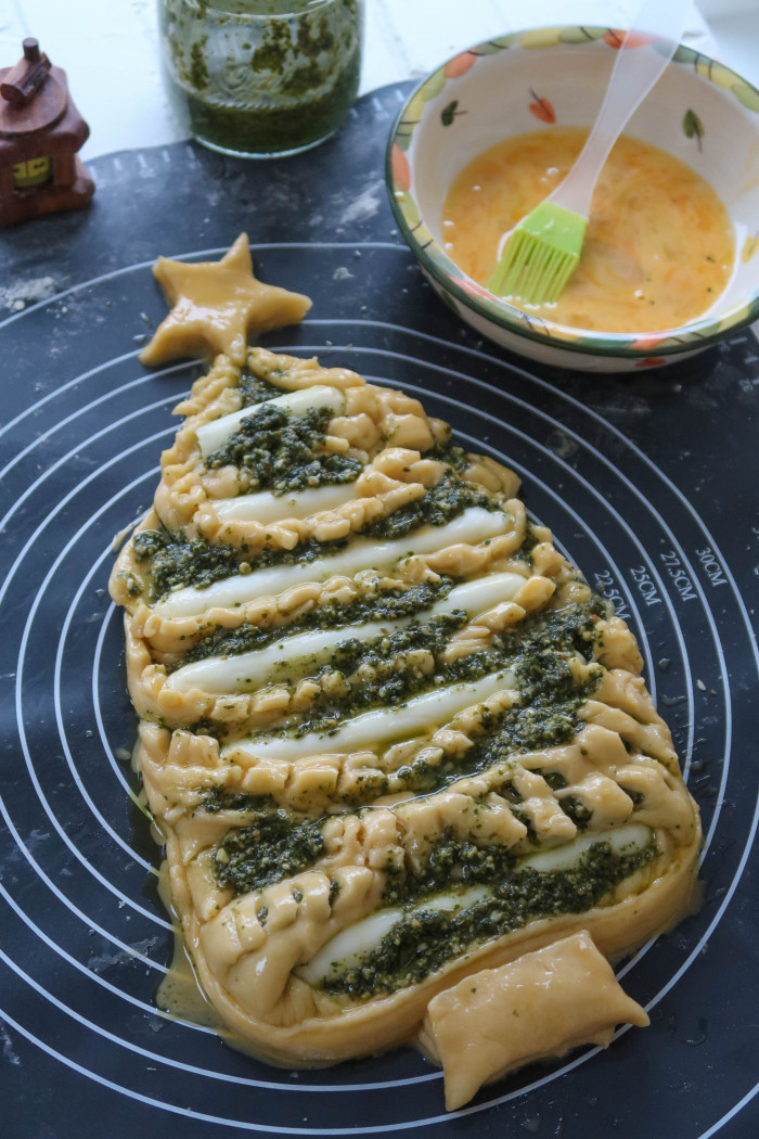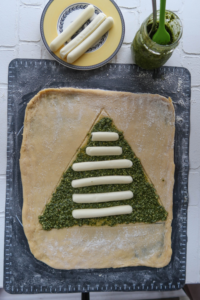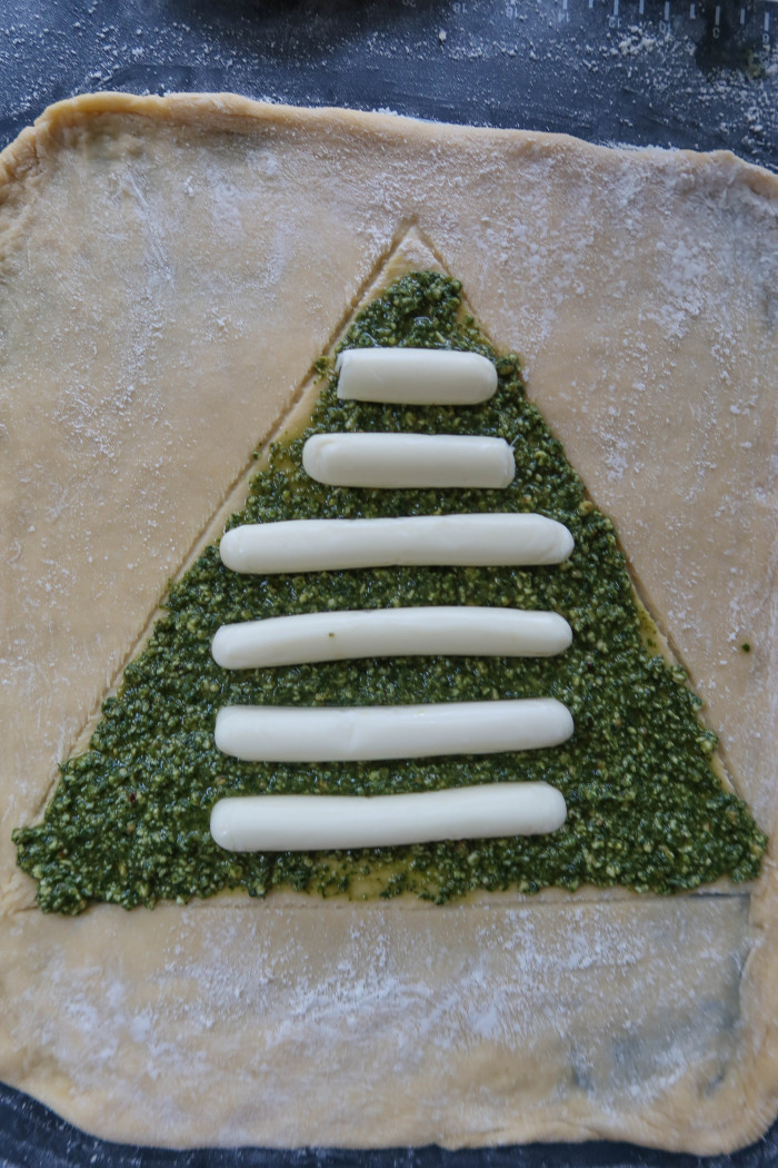 Выложите песто на треугольник. Далее моцареллу полосками или шариками, так чтобы накрыть их затем полосками теста сверху. Между ними можно добавить еще немного теста для зеленого цвета).