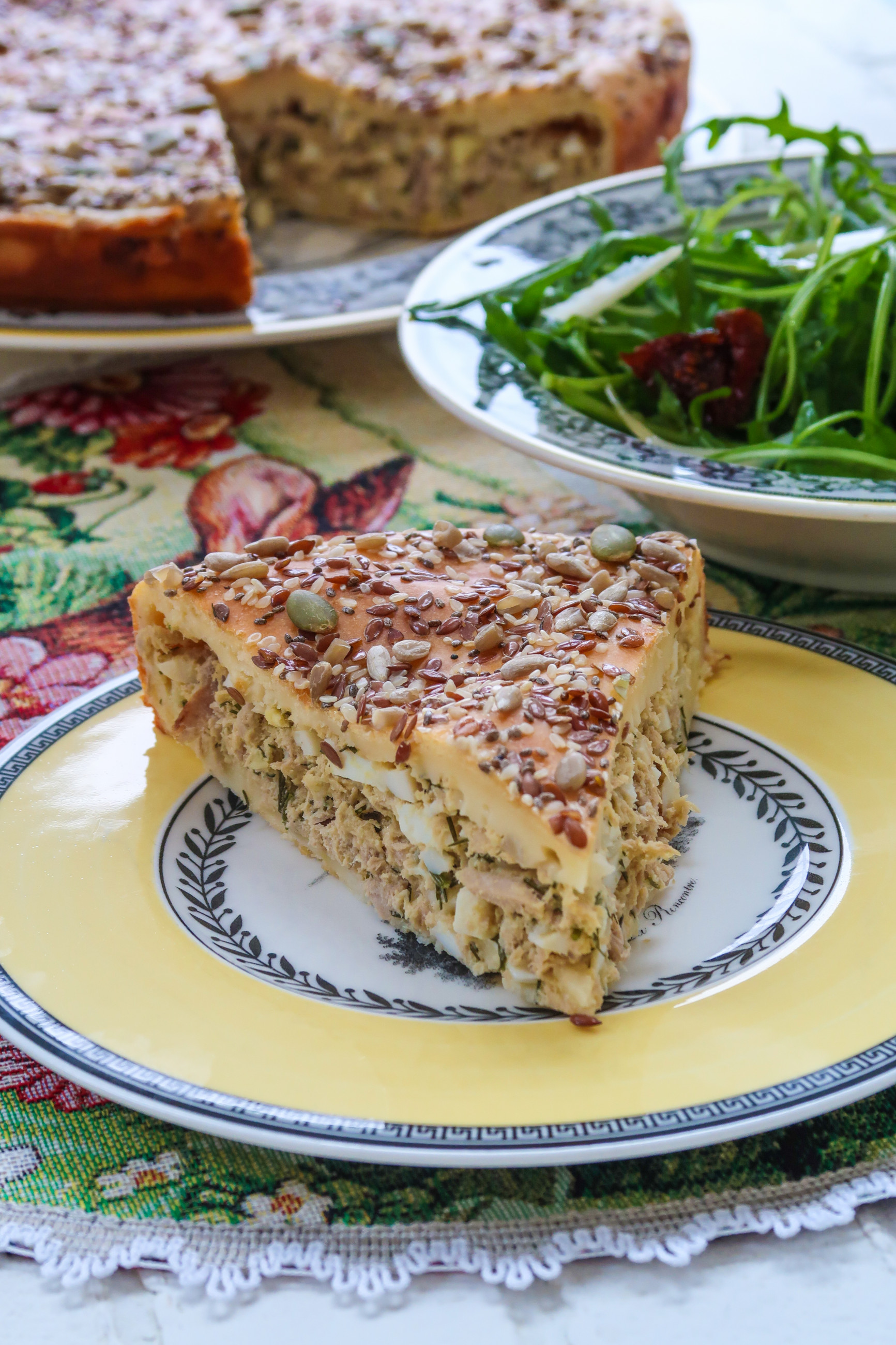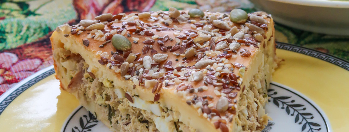 Этот пирог я приготовила после Пасхи, когда осталось много яиц и получилось весьма удачное сочетание ингредиентов. Теста мало, начинки много, да еще с большим содержанием белка, что делает его идеальным завтраком, просто добавив немного зелени.