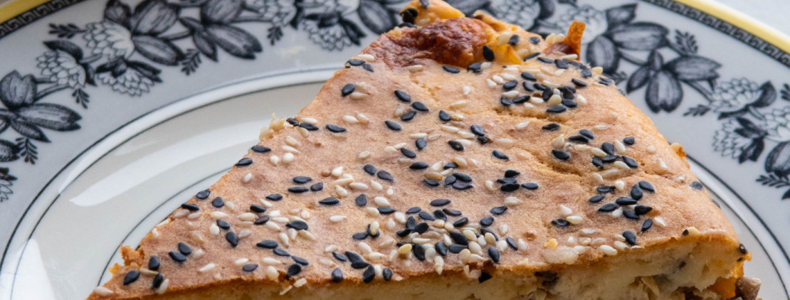 Влейте 1\2 теста на дно формы, далее выложите остывшую начинку (слегка отходя от краев), посыпьте сыром и распределите вторую половину теста. Разравняйте ложкой и посыпьте кунжутным семенем.