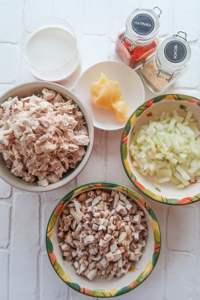 Добавьте мясо курицы. Влейте сливки и бульон. Добавьте специи и соль по вкусу. Тушите на медленном огне несколько минут. Начинку остудите.