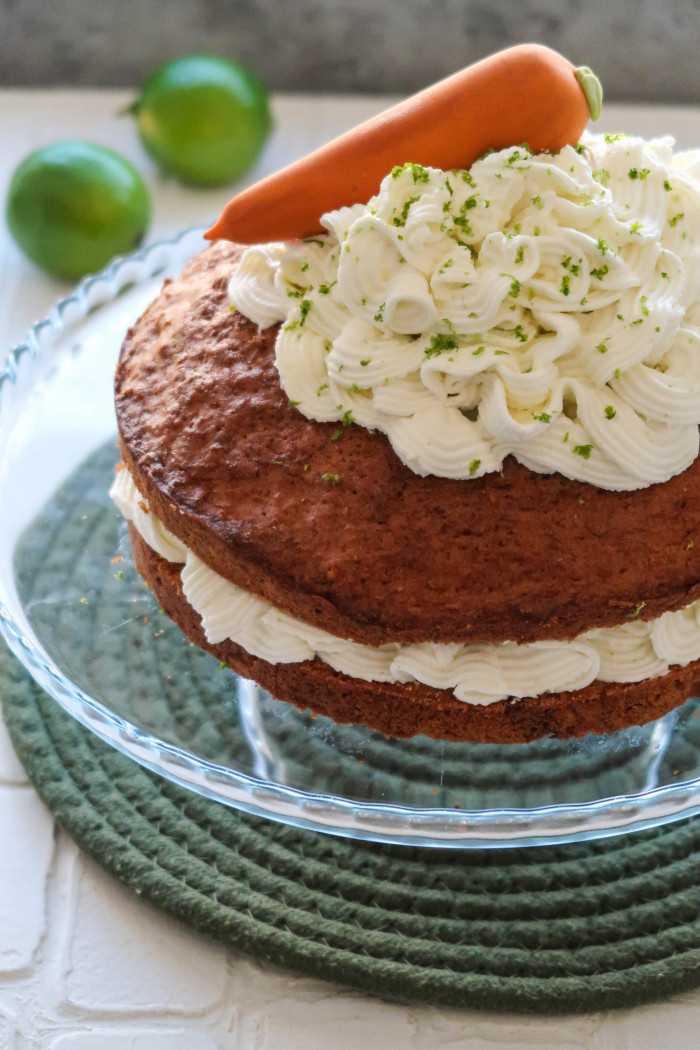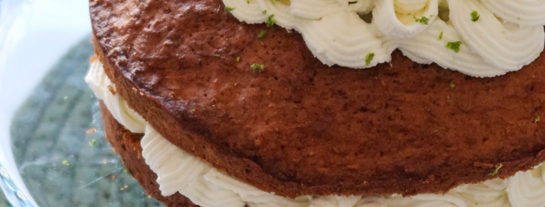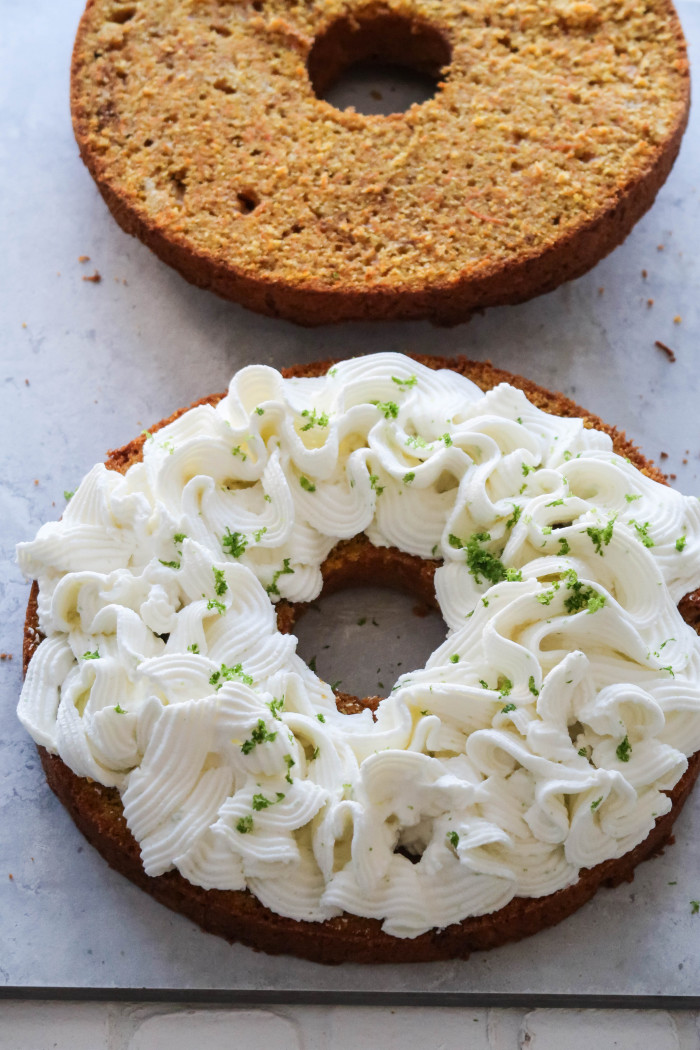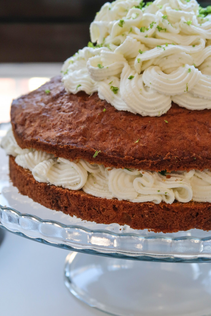 Нанесите 1\2 крема на одну половину бисквита, накройте второй и снова выложите крем. Сверху можно посыпать небольшим количеством лаймовой цедры.