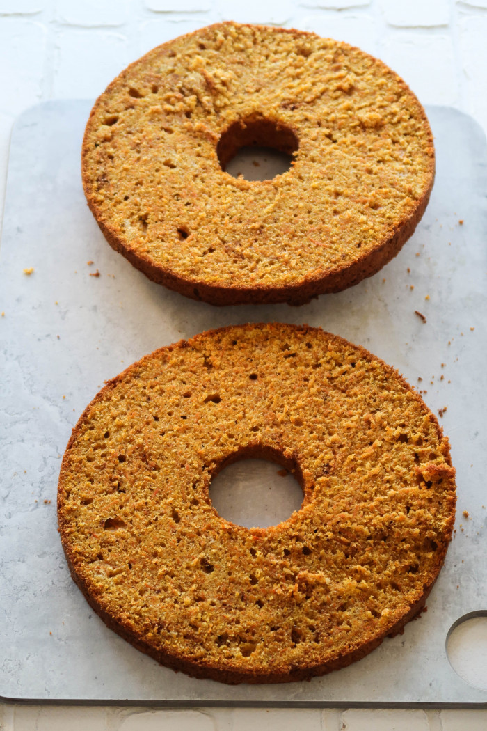 Когда пирог остынет аккуратно вытащите его из формы. Острым ножом разрежьте бисквит на две половинки.