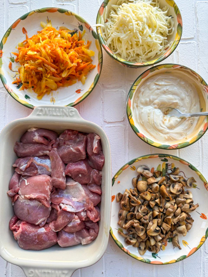 Выложите в подходящую по размеру форму кусочки мяса, далее лук с морковью, грибы и сверху соус.