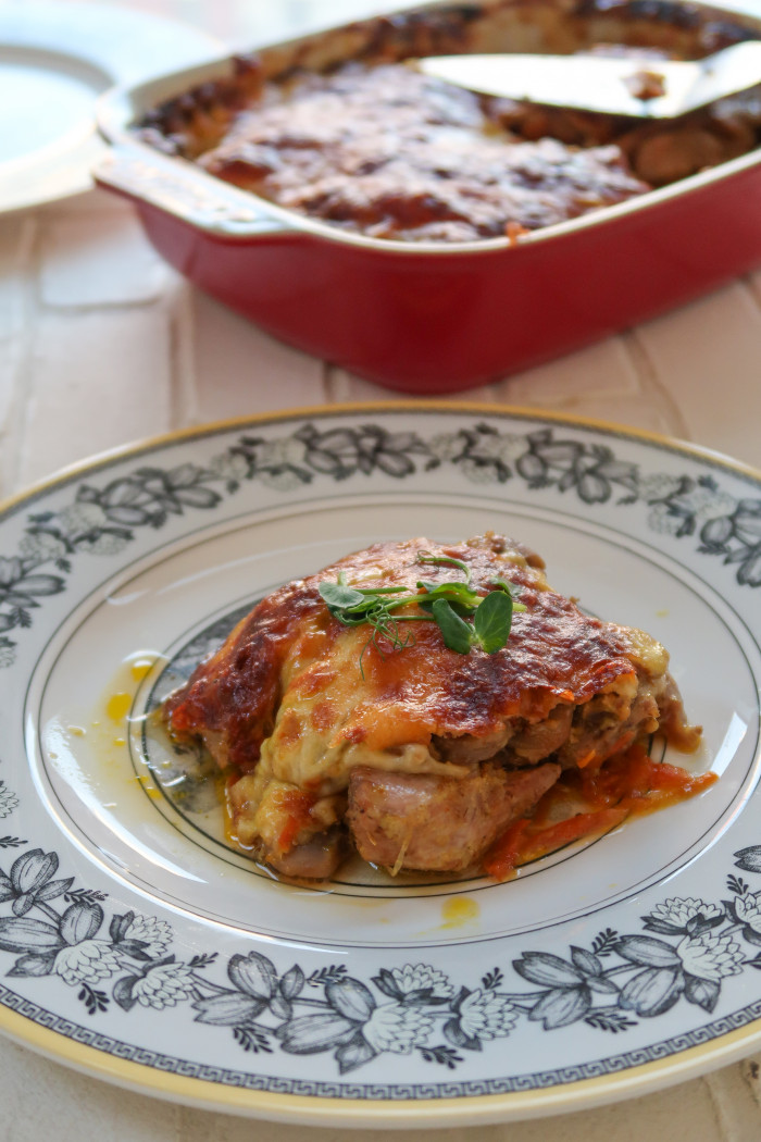 Запекайте в заранее разогретой духовке (противень тоже хорошо разогрейте в ней заранее) при 200 гр. около 60 минут. Через 30 минут закройте блюдо фольгой, или чуть раньше если цвет будет слишком румяный на ваш взгляд. За 10 минут до готовности откройте и посыпьте сыром и держите в духовке до красивого румяного цвета.