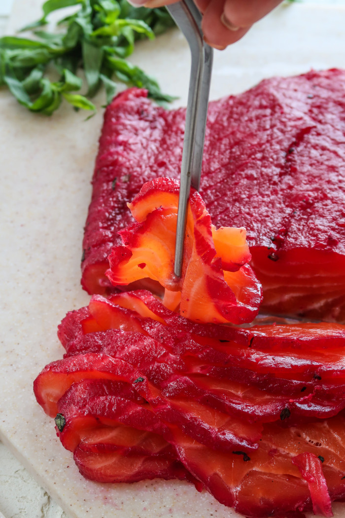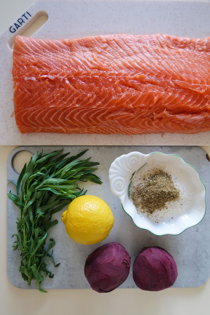Это очень вкусный рецепт приготовления лосося слабой соли. Свекла придает слегка землистый привкус, который как оказалось очень подходит лососю, тархун придает яркую нотку свежести, а лимон, ну этот всегда дружит с рыбой.