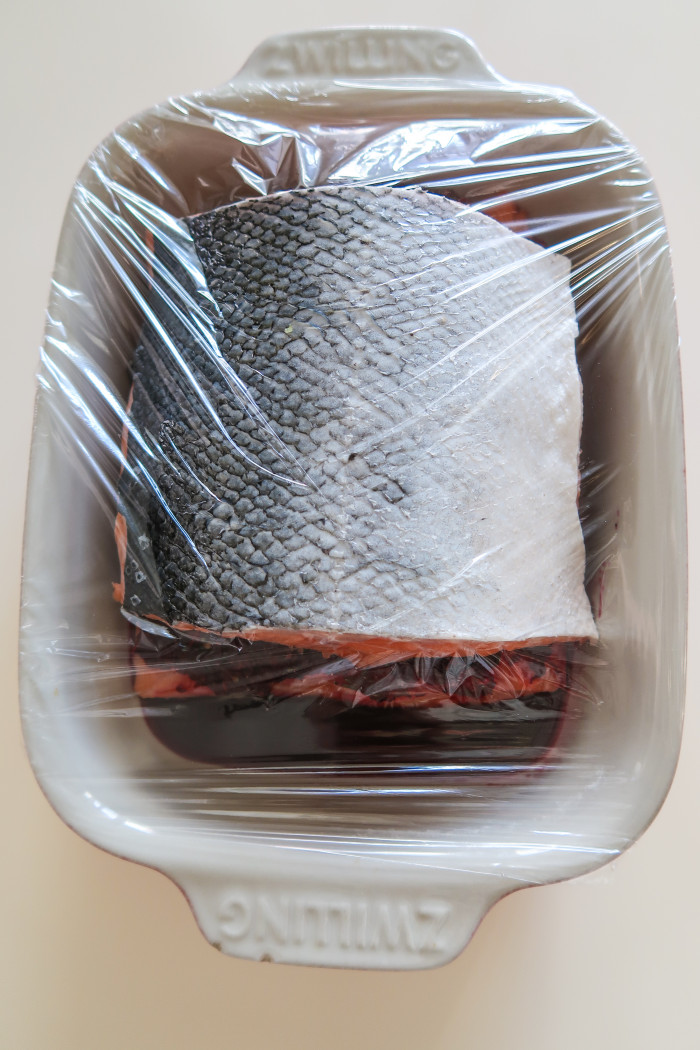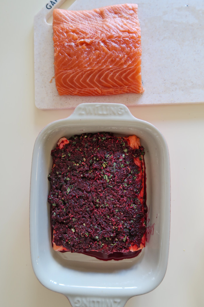 Выложите филе в подходящую по размеру форму, можно предварительно разделив его на два кусочка. Сверху выложите свекольный маринад. Накройте пищевой пленкой и уберите в холодильник на 12 часов.