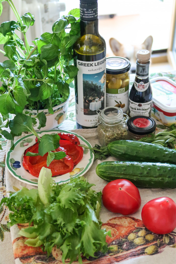 Это очень интересный вариант греческого салата, с натертой брынзой (или фетой) получается, как соус. Запеченный перец в салате — это песня. Его количество мне даже не хватило, поэтому запекайте побольше. Не жалейте оливкового масла и зелени!