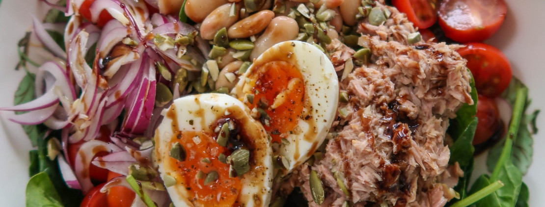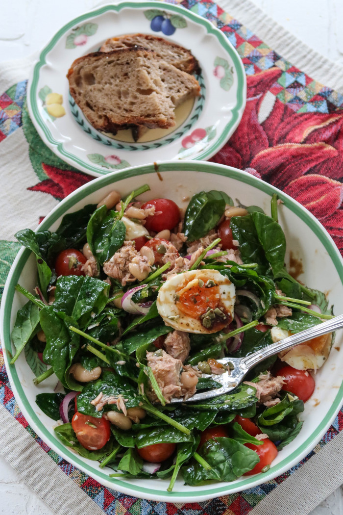 Свежий шпинат, сладкие помидоры, тунец, белая фасоль, красный лук, тыквенные семечки -сочетание ингредиентов идеальное по вкусу, да и не только. Любой врач и диетолог поставит нам пятерку за такой салат.