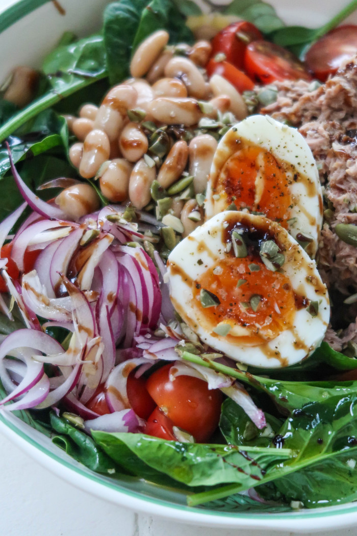 Выложите порционно помидоры, сверху шпинат, далее тунец и фасоль, добавьте лук и посыпьте тыквенными семечками. по желанию добавьте яйцо.