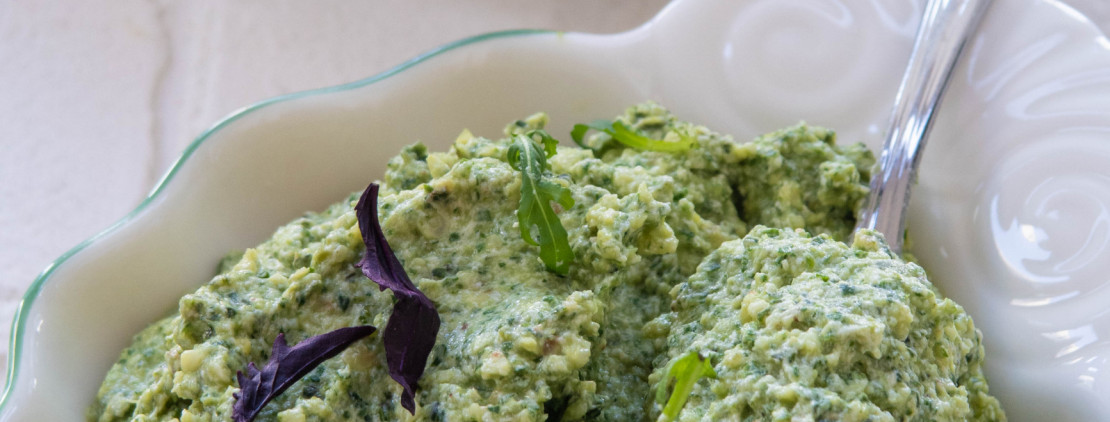 Нарежьте зелень, пармезан натрите на мелкой терке. Измельчите все ингредиенты в кухонном комбайне, постепенно вливая сливки. Количество сливок можно варьировать в зависимости от желаемой консистенции соуса.