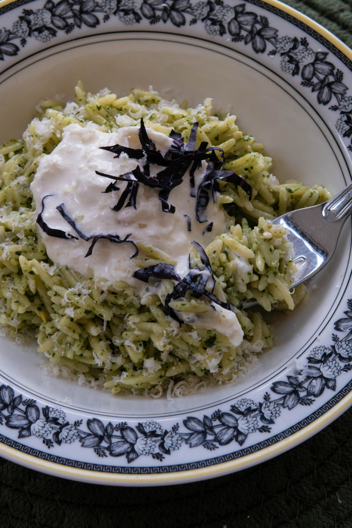 Для приготовления ризони (или орзо) отварите пасту в подсоленной воде в течение 8 минут (если на упаковке написано 10 минут). На 200 гр. пасту необходимо минимум литр воды и крупная щепотка соли. Откиньте на сито, далее добавьте немного оливкового масла и храните до приготовления с песто. Далее поставьте сотейник на плиту, добавьте немного оливкового или сливочного масла, теперь пасту и примерно 100 гр. сливочного песта. По желанию можно добавить еще немного тертого пармезана и кипятка (в идеале бульона конечно-же). Перемешайте и подавайте, в идеале со страчателлой и измельченным базиликом.
