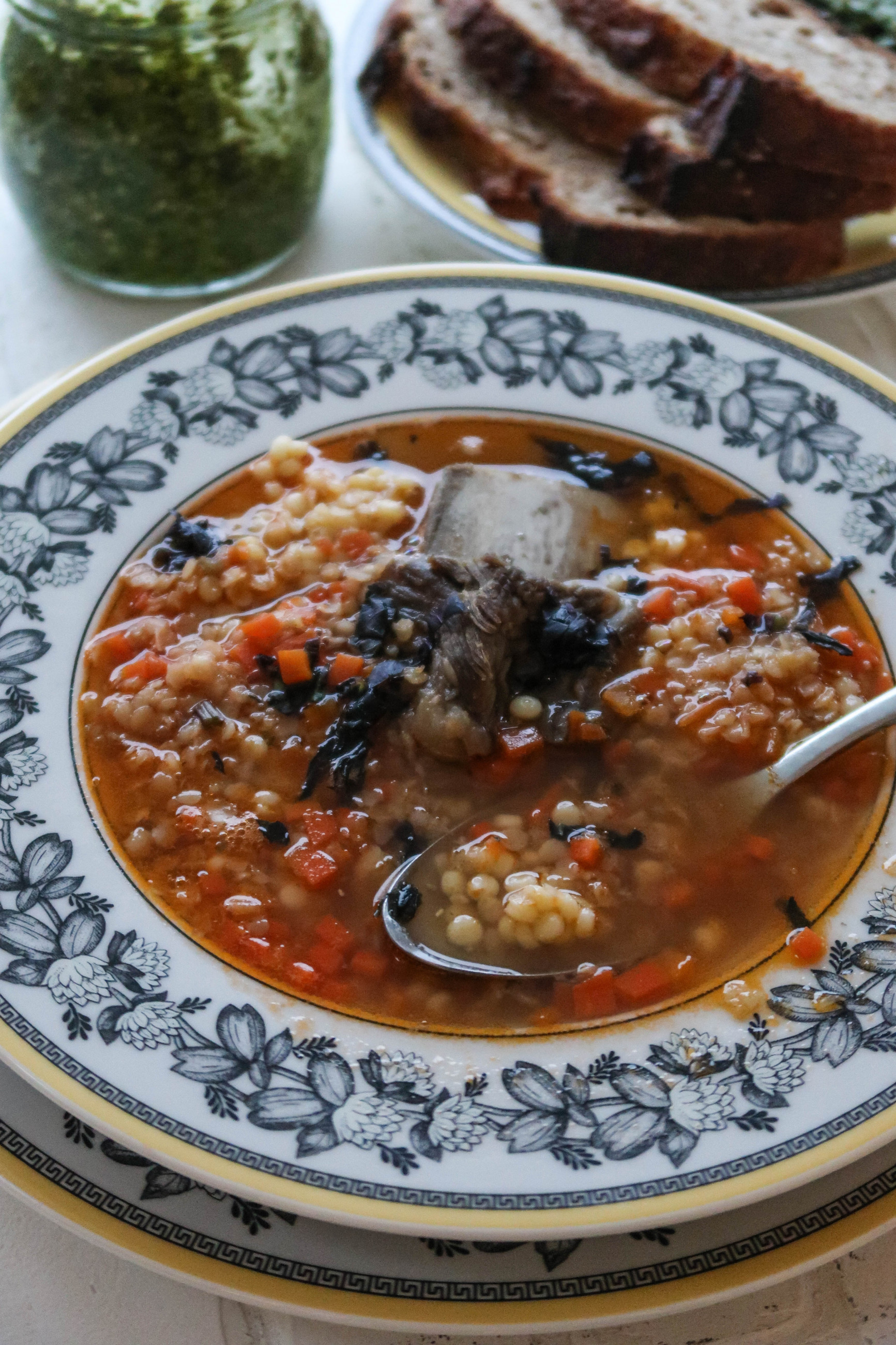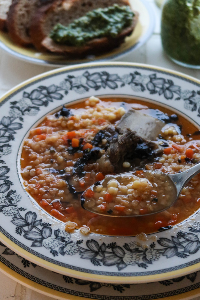 При подаче добавьте свежую зелень и говяжье ребро.