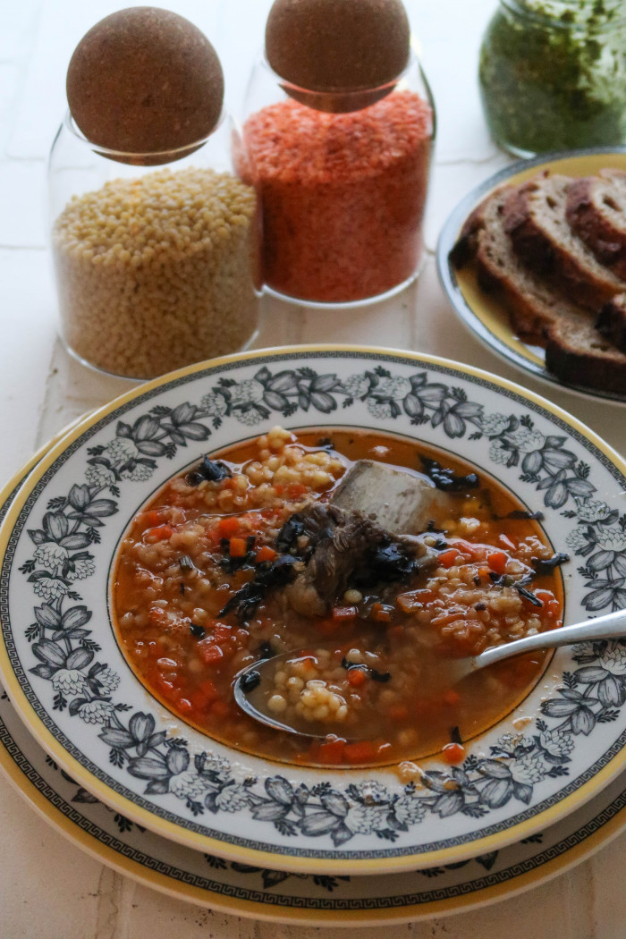 Вытащите из готового бульона все сваренные овощи и выбросите. Добавьте чечевицу и обжаренную морковь. Варите на небольшом огне в течении 20 минут. За несколько минут добавьте птитим. Добавьте соль по вкусу. Выключите и дайте постоять перед подачей минут 10, как раз паста дойдёт. Можно приготовить пасту отдельно и добавлять порционно в тарелку.